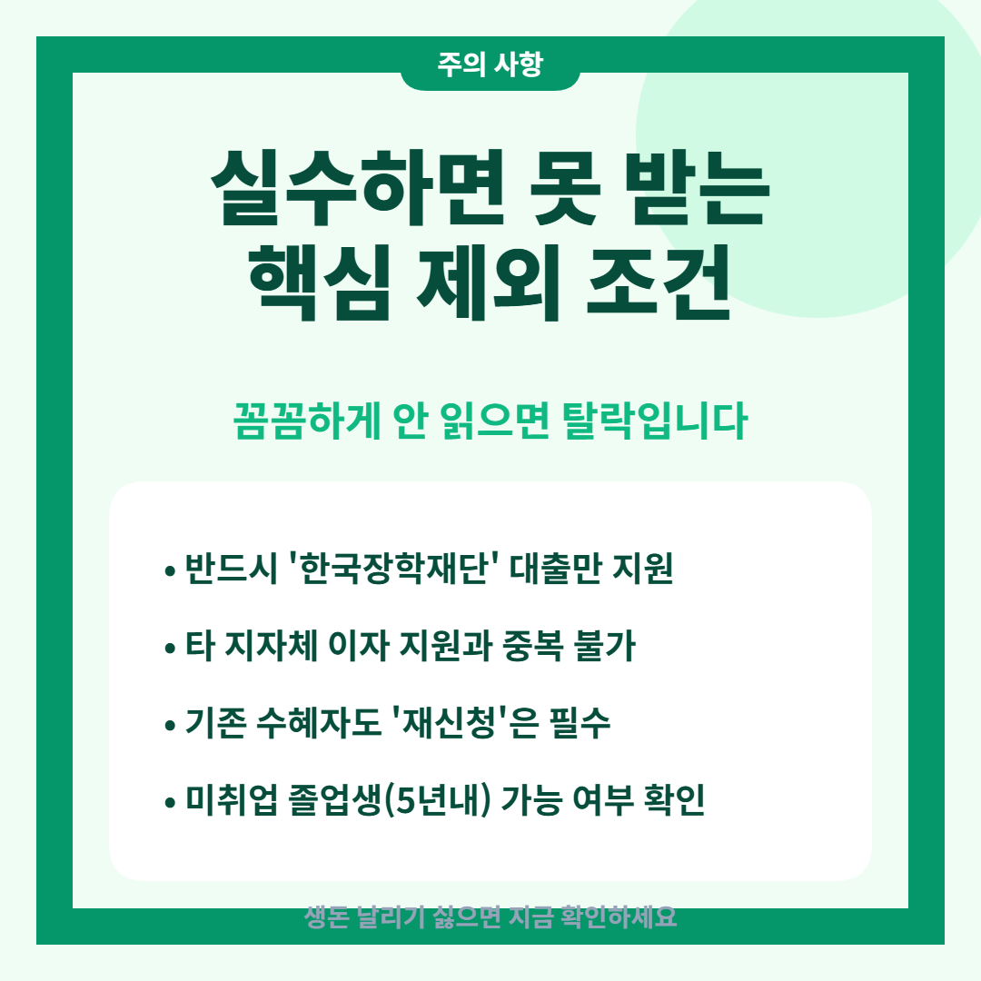 단, 주의할 점이 있어요. 반드시 '한국장학재단'을 통해 받은 대출이어야 합니다. 그리고 다른 지자체에서 이미 비슷한 지원을 받고 있다면 중복 지원은 안 된다는 점, 꼭 기억하세요. 우리 자녀가 조건에 맞는지 지금 당장 주민등록본부터 확인해 보시는 센스, 잊지 마세요!