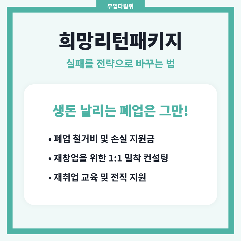 희망리턴패키지를 통해 전문가의 컨설팅을 받고, 전직 교육을 받거나 재창업 지원금을 받는다면 오히려 이전보다 더 단단한 비즈니스 모델을 구축할 수 있습니다.