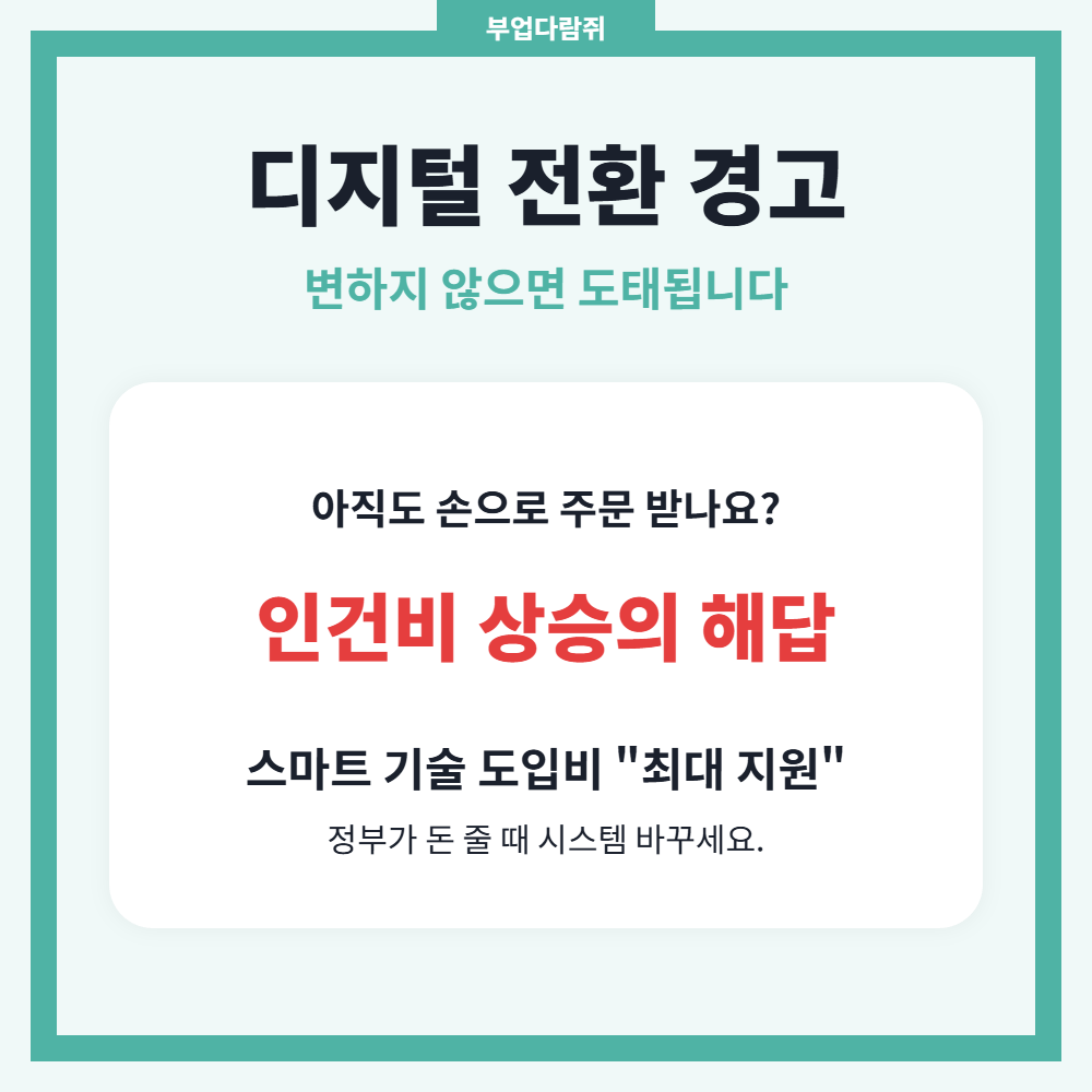 5060 세대 사장님들은 "기계 쓰는 거 어려워", "손님들이 불편해해"라고 핑계를 대시지만, 사실은 사장님이 배우기 귀찮은 것 아닌가요? 요즘 중학생들도 키오스크로 주문하는 걸 당연하게 생각합니다. 스마트 기술을 도입하면 주문 실수가 줄어들고, 사장님은 그 시간에 고객 서비스나 제품 품질에 더 집중할 수 있어 결과적으로 매출이 오를 수밖에 없어요.