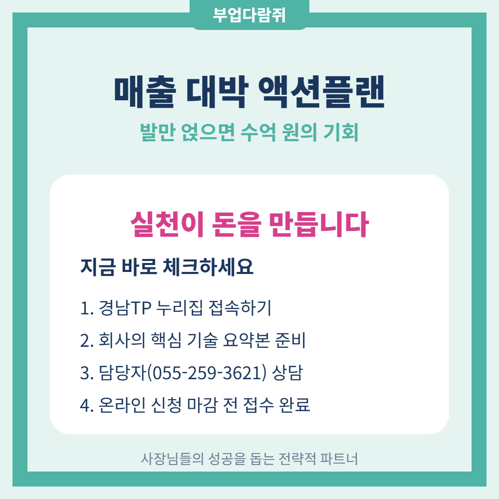 정부가 밀어주고 경남TP가 끌어주는 이 판에 발만 얹으시면 됩니다. 미루다 보면 올해 공모 과제들은 이미 다른 업체 차지가 될 거예요. 지금 바로 경남테크노파크 홈페이지를 확인하세요.