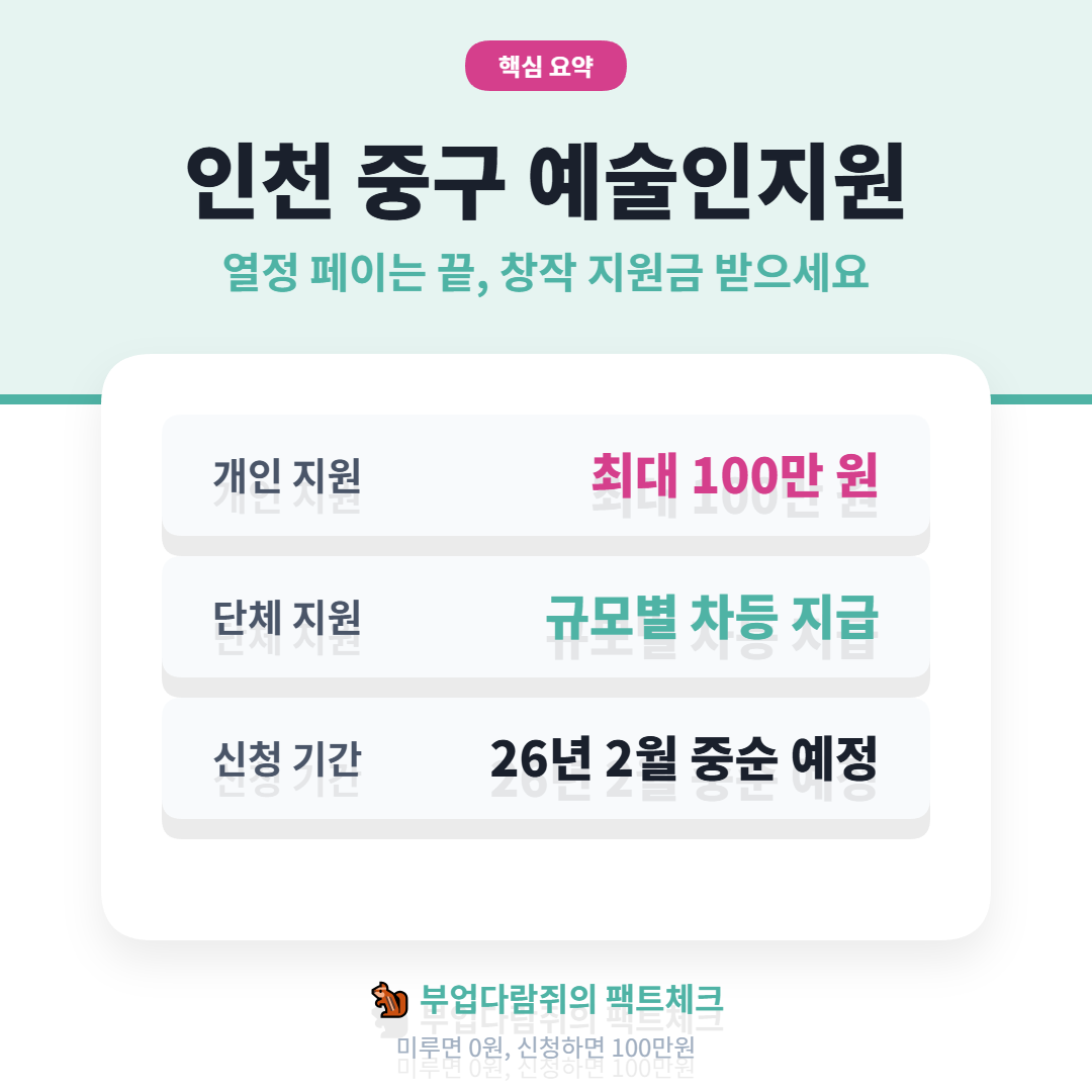 | 지원 대상 | 인천 중구 거주 또는 활동 중인 전문 예술인 및 단체 |