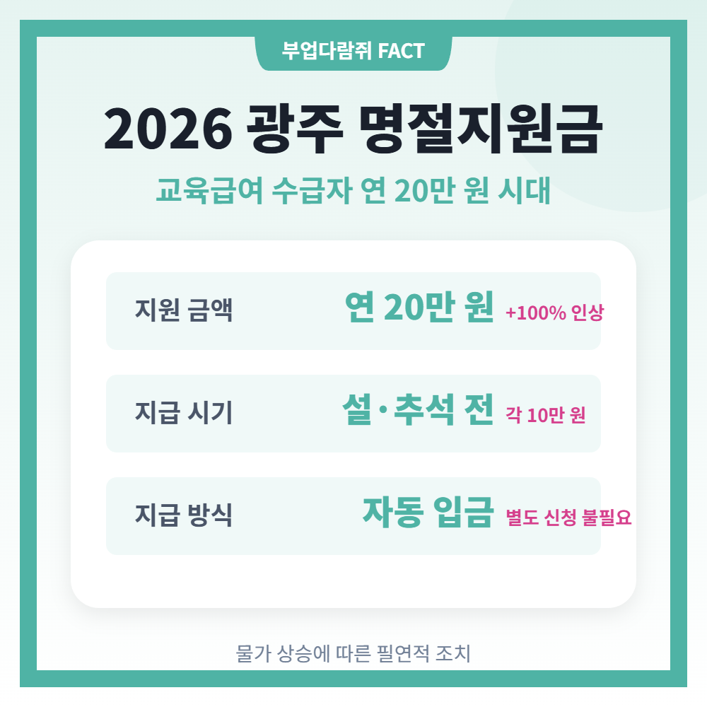| 지원 금액 | 연간 총 20만 원 (설·추석 각 10만 원) | 기존 대비 100% 인상 |