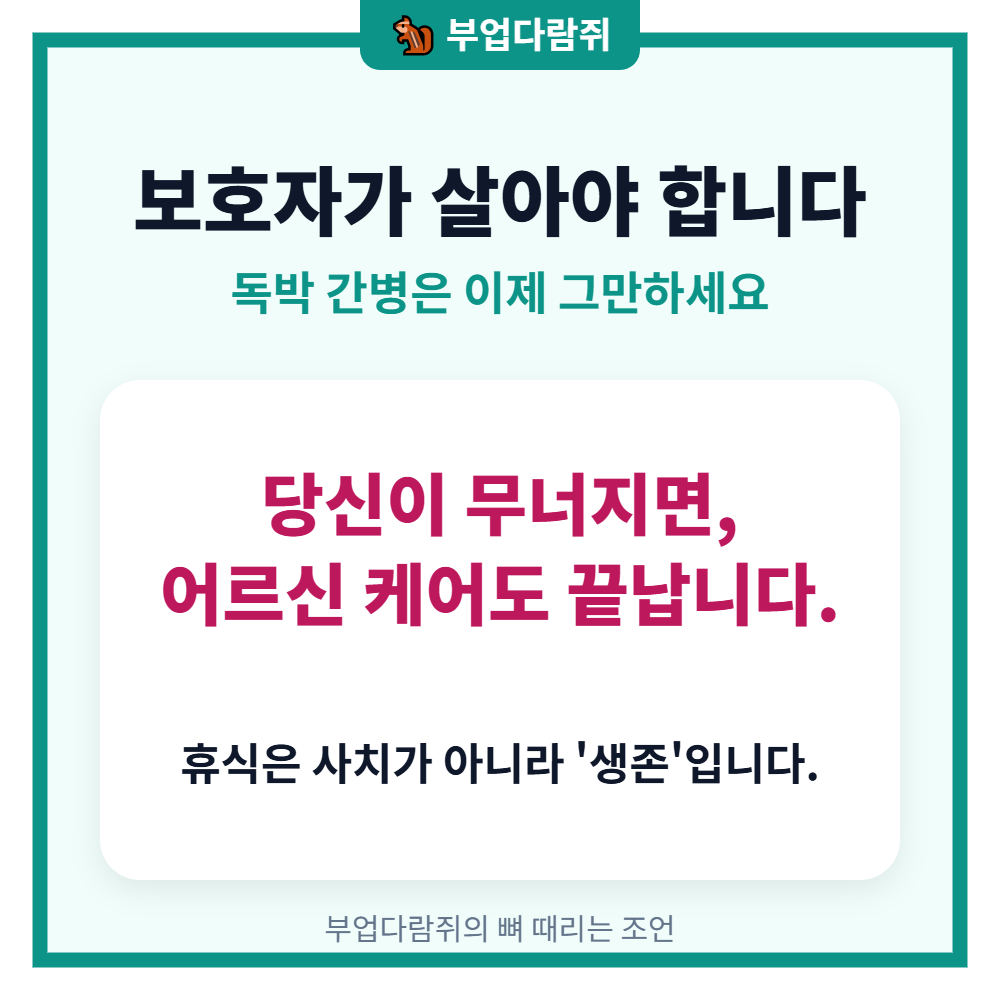 그런데 생각해보세요, 간병하는 사람이 무너지면 어르신 케어는 누가 하나요? 보호자의 휴식은 단순한 사치가 아니라 어르신을 더 잘 모시기 위한 필수 생존 전략입니다.