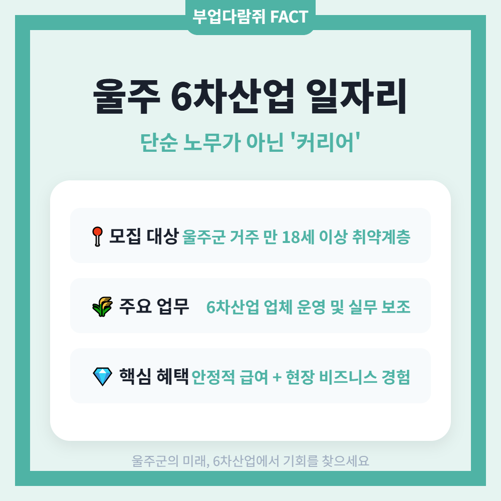 이번 사업은 울주군의 유망한 6차산업 인증업체에서 직접 실무를 배울 수 있습니다. 단순히 보조 업무를 넘어서 농촌 비즈니스가 어떻게 돌아가는지 몸소 체험할 수 있는 거죠. 이건 단순 일자리가 아니라 '창업 교육'이나 다름없습니다.
