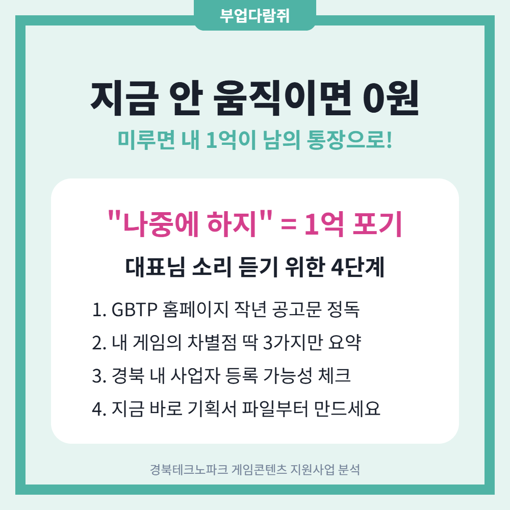한 명은 1억 원 지원받아서 멋진 게임 출시하고 대표님 소리 듣고 있을 때, 다른 한 명은 여전히 "나도 할걸" 하며 한숨만 쉬고 있을 겁니다. 기회는 왔을 때 잡는 게 아니라, 잡을 준비가 된 사람에게만 보이는 법이에요.