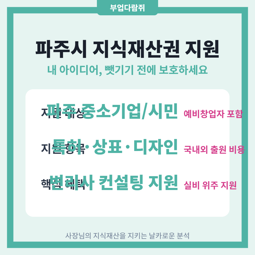 행동하지 않으면 아무 일도 일어나지 않습니다. 지금 바로 파주시청 홈페이지나 경기지식재산센터 공고를 확인하고 내 권리를 선점하세요.