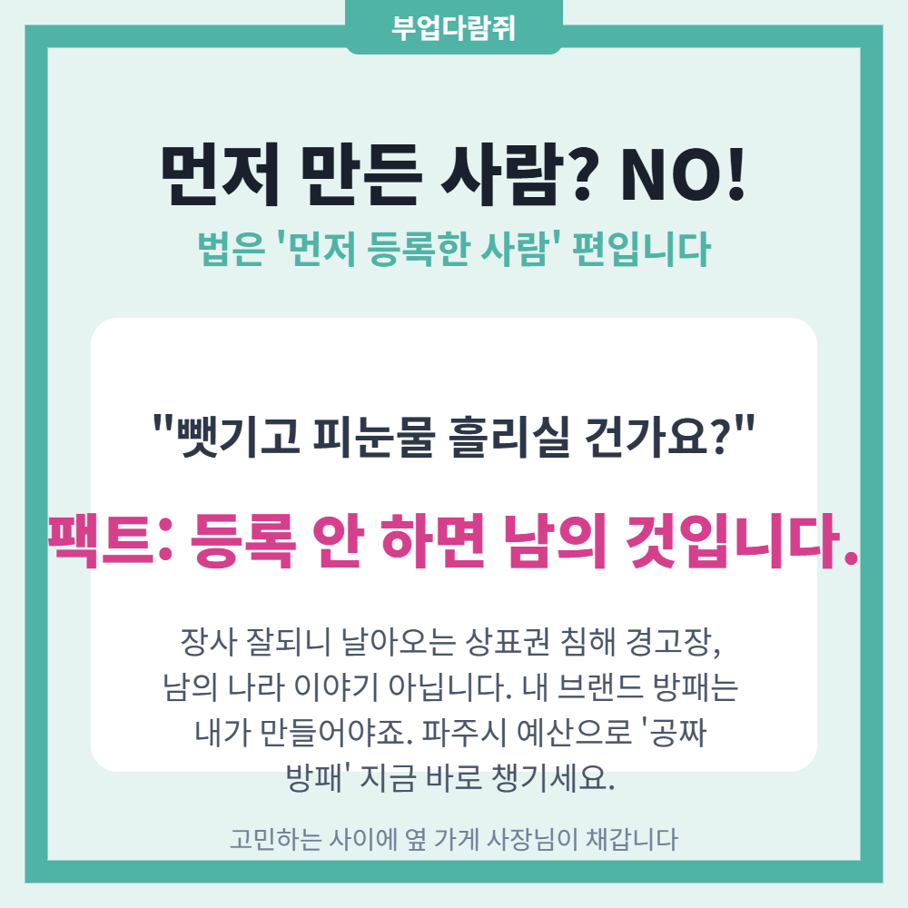 법은 '먼저 만든 사람'이 아니라 '먼저 등록한 사람'의 편입니다. 내 권리는 내가 먼저 챙겨야 하는 게 이 바닥의 상식이에요.