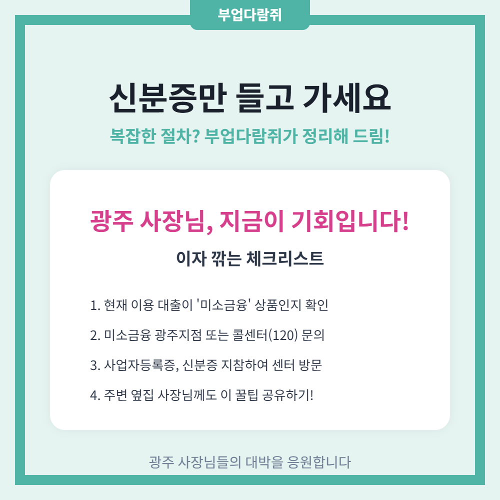 상담 센터 전화: 미소금융 광주지점이나 광주광역시 콜센터(120)에 전화해서 지원 대상 여부를 즉시 문의하세요.
