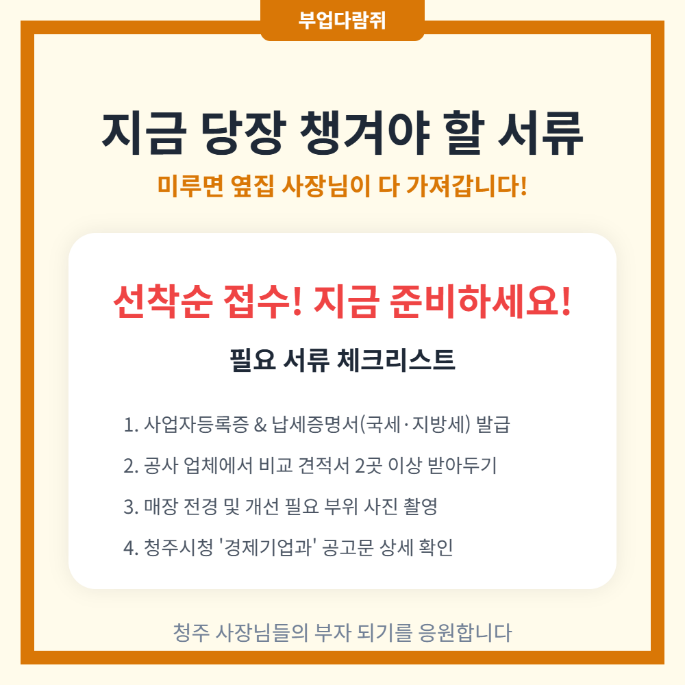 해답은 간단해요. 청주시에 사업장을 두고, 공고일 기준으로 6개월 이상 영업 중인 소상공인이라면 일단 자격 합격입니다! 국세나 지방세 체납만 없다면 큰 걸림돌 없이 신청 단계로 진입하실 수 있어요.